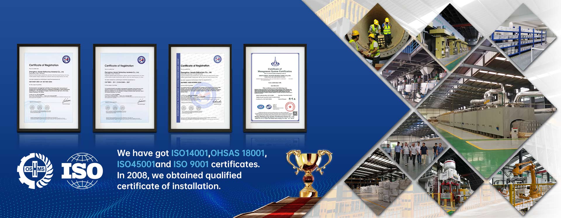 公司致力于耐火新材料、新技術(shù)、新產(chǎn)品的開(kāi)發(fā)和推廣應(yīng)用,是國(guó)家高新技術(shù)企業(yè),產(chǎn)品先后通過(guò)了ISO9001質(zhì)量管理體系、ISO14001環(huán)境管理體系、GB/T28001職業(yè)健康安全管理體系認(rèn)證,同時(shí)具有防水防腐保溫工程專(zhuān)業(yè)承包貳級(jí)資質(zhì)、冶金工程施工總承包叁級(jí)資質(zhì)、環(huán)保工程專(zhuān)業(yè)承包叁級(jí)資質(zhì)。