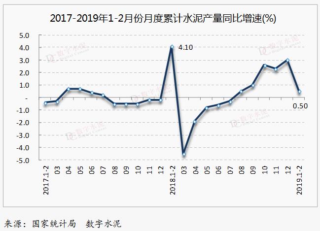 2019年1-2月份,全國累計水泥產量2.12億噸,同比增長0.5%,增速較去年同期下降3.6個百分點。