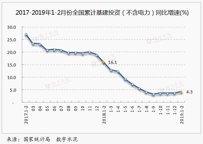 2019年1-2月份,全國基礎設施投資(不含電力)同比增長4.3%,增速比2018年全年提高0.5個百分點,低于去年同期11.8個百分點。其中,水利管理業投資下降1.8%,降幅收窄3.1個百分點;道路運輸業投資增長13%,增速提高4.8個百分點;鐵路運輸業投資增長22.5%,2018年全年為下降5.1%。